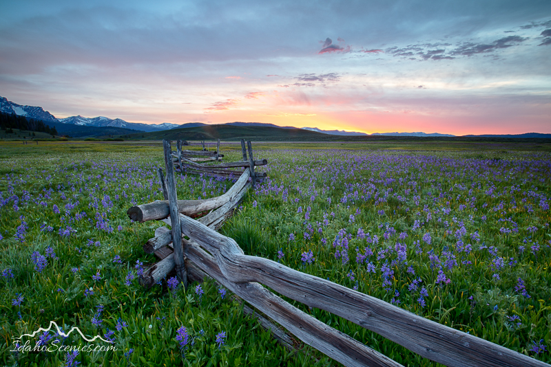_L6A1398_HDR June 23, 2016 800 × 534 Spring Outings Idaho, South central, SNRA, Stanley. Camas Lilies and log fence in late spring in the Sawtooth National Recreation Area.